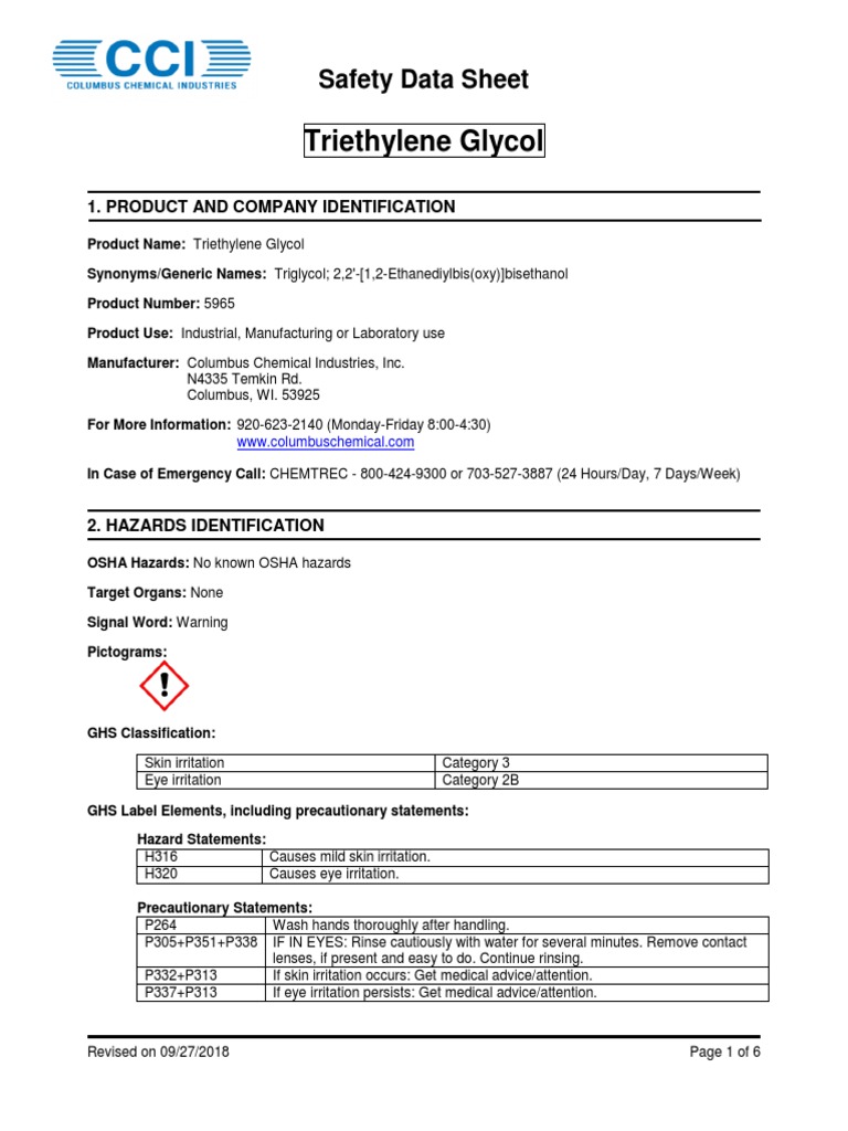 Triethylene Glycol Material Safety Data Sheet (MSDS) DocsLib