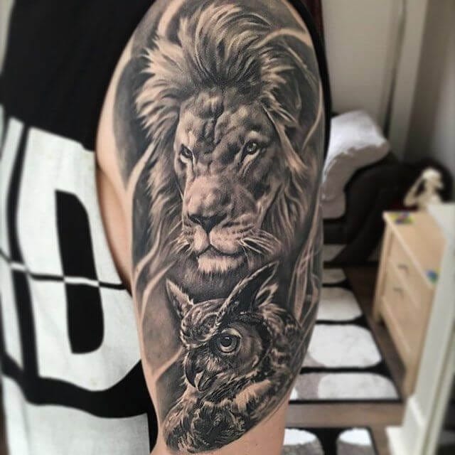 Lion and owl men’s sleeve tattoo design in black and grey Mens sleeve