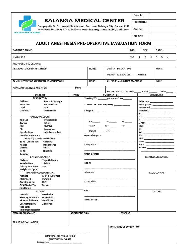 10 Adult Anesthesia PreOperative Evaluation Form PDF Anesthesia